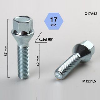 Kolový šroub M12x1,5x42, dosedací plocha kužel 60°, celková výška 67mm, pevnostní šroub určený k uchycení ALU disků k automobilu.