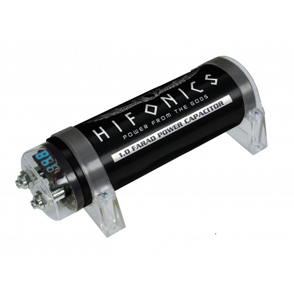 Zbrusu nový jednofaradový kapacitor v černém provedení s digitálním voltmetrem a modrými číslicemi.