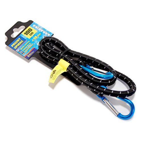 Pružný upínače vysoké kvality, zesílený, homologace TÜV/GS. Zakončeno karabinami pro dokonalé upevnění. Délka 100cm, průměr 10mm.