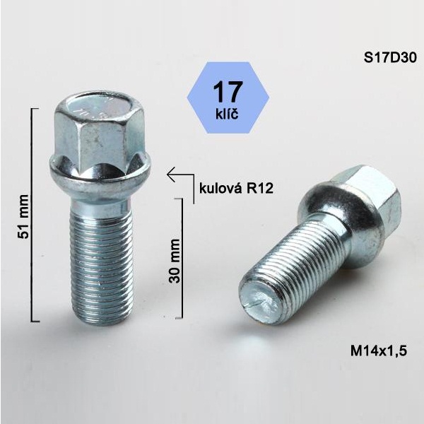 Kolový šroub M14x1,5x30, dosedací plocha koule R12, celková výška 51mm, pevnostní šroub určený k uchycení plechových nebo ALU disků k automobilu.