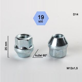 Kolová matice M12x1,5, dosedací plocha kužel 60°, celková výška 25 mm, hlava klíče 19mm, pevnostní matice určená k uchycení ALU disků k automobilu.