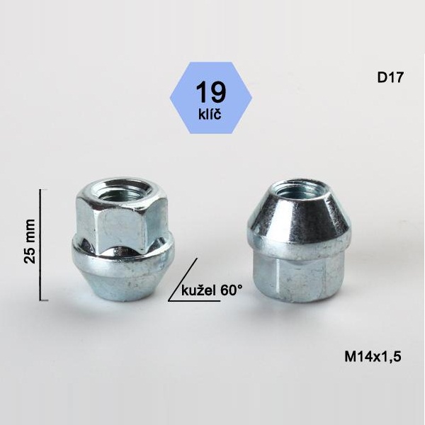 Kolová matice M14x1,5, dosedací plocha kužel 60°, celková výška 25 mm, hlava klíče 19mm, pevnostní matice určená k uchycení ALU disků k automobilu.