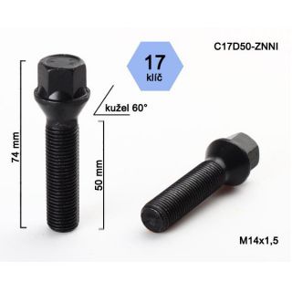 Kolový šroub M14x1,5x50, dosedací plocha kužel 60°(černý), celková výška 74 mm, pevnostní šroub určený k uchycení ALU disků k automobilu.