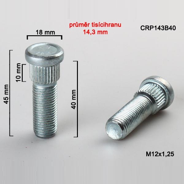 Kolový šteft (svorník) M12x1,25x40 (celková délka), průměr tisícihranu 14,3 mm, pevnostní šteft určený k uchycení plechových nebo ALU disků k automobilu.