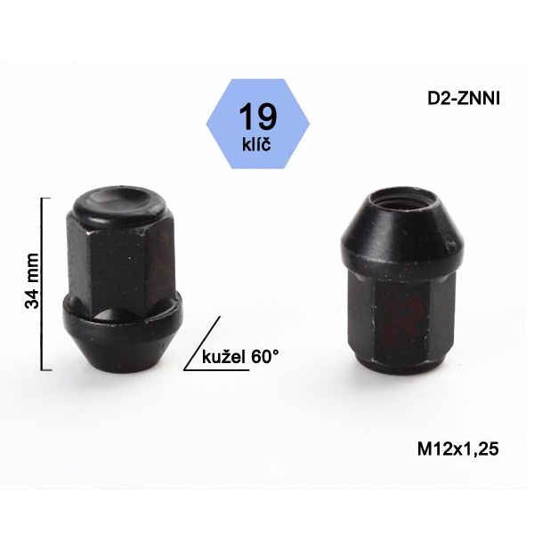 Kolová matice M12x1,25 černá, dosedací plocha kužel 60°, délka závitu 30 mm, celková výška 34mm, hlava klíče 19mm, pevnostní matice určená k uchycení ALU disků k automobilu.