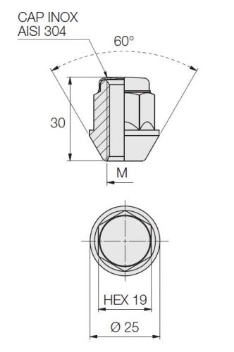 Matice M12x1,25 kužel (nerez víčko), klíč 19, výška 30