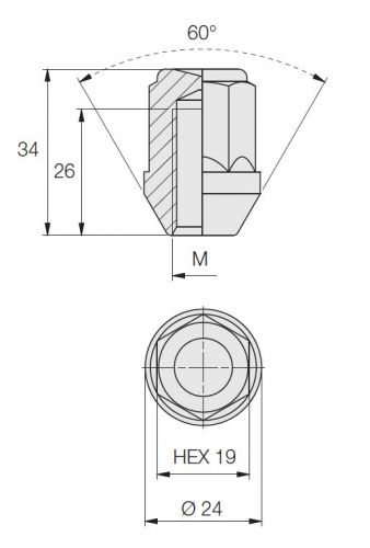 Matice M12x1,25 kužel zavřená, klíč 19; výška 34