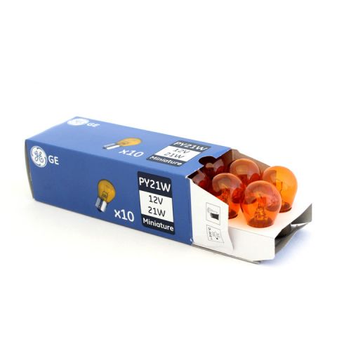 Vláknová žárovka General Electric s paticí BAU15s, žluté světlo, 21W, 12V, vhodná do předních nebo zadních směrových světel. Použití závisí na konstrukci světel vozidla. V balení 10ks.