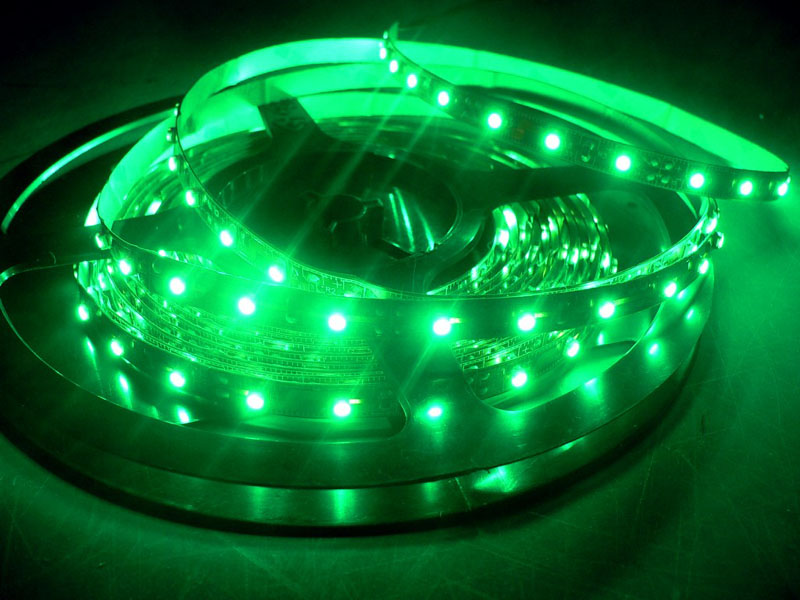 Pružný zelený pásek se svítivými LED diodami, napájení 12V.