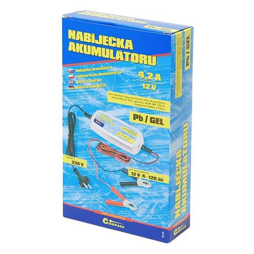 Univerzální přenosná nabíječka akumulátorů 12V 4,2A, napájení 230V. Určeno pro všechny typy 12V olověných (Pb) akumulátorů - bezúdržbové GEL (gelové), AGM, MF, VRLA, údržbové PbWet a PbCa. Stabilní nabíjecí proud 4,2 A, pulzní dobíjení prodlužuje životnost baterie a udržuje ji v lepší kondici. Napájecí napětí 230 V ~ 50Hz, příkon max 65W, určeno pro akumulátory 12V 4 - 120 Ah.