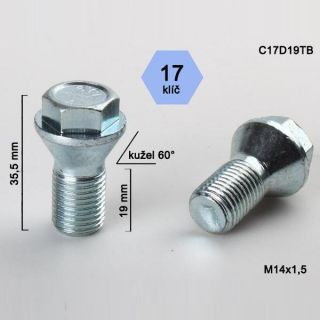 Kolový šroub M14x1,5x19 s krátkou hlavou, dosedací plocha kužel 60°, celková výška 35,5 mm, pevnostní šroub určený k uchycení rozšiřovacích podložek k automobilu.