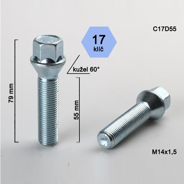 Kolový šroub M14x1,5x55, dosedací plocha kužel 60°, celková výška 79mm, pevnostní šroub určený k uchycení ALU disků k automobilu.