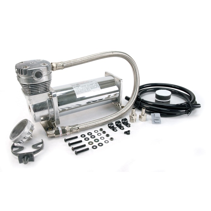 Kompresor VIAIR pro použití v systémech vzduchových podvozků. Model 480C je vrcholovým modelem v nabídce VIAIR se 100% pracovním cyklem při tlaku 100PSI (6,895bar) a s maximálním produkovaným tlakem 200PSI (13,79bar). Kompresor je vyveden v celochromovém provedení.