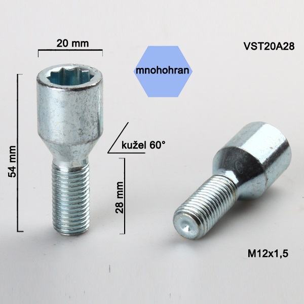 Šroub M12x1,5x28 kužel s vnitřním mnohohranem, průměr hlavy 20mm, výška 54