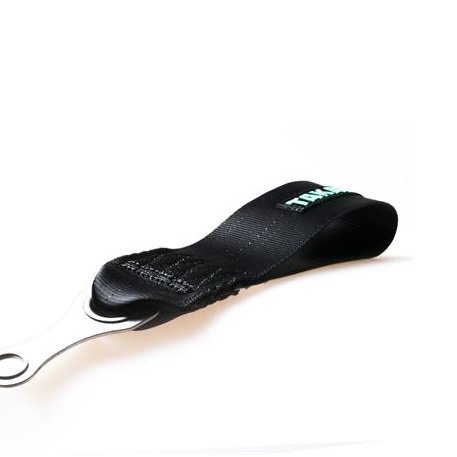 TAKATA textilní tažné oko v černém provedení s vyšitým logem TAKATA. Součástí oka je nerezová spona pro uchycení max. 12mm šroubem. S tímto textilním tažným okem je možné táhnout vůz do hmotnosti 1800kg.